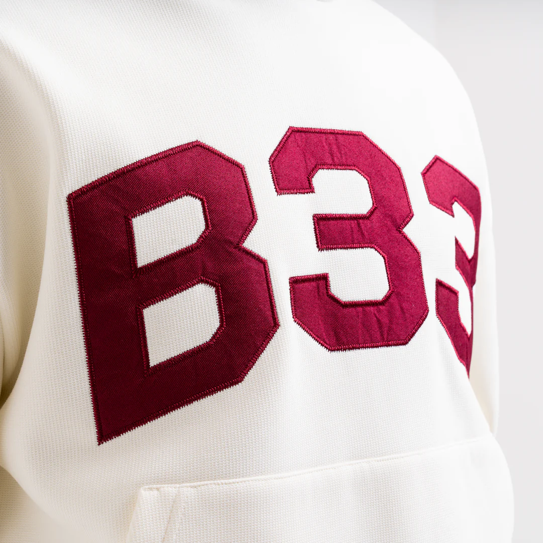 Elevate your style with our new Figo Hoodie in off white, crafted from premium waffle fabric with a super soft brushed backing for unbeatable comfort. Featuring an oversized silhouette for a relaxed, effortless look and a bold B33 logo across the chest for a statement finish. Completed with patch detailing on the sleeve.